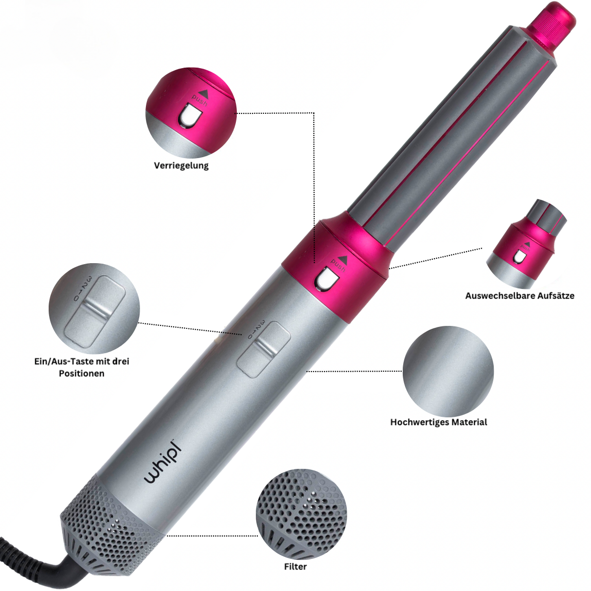 Den Whipl™ AirStyler gör det hela arbete för dig! Han byter från ett läge till ett annat, oavsett om det är så Torr, Utjämning, Lockar magi eller Vågor skapa genom att använda de 5 olika bilagorna med bara en Tryck på en knapp ändra - Fantastiskt, eller hur?