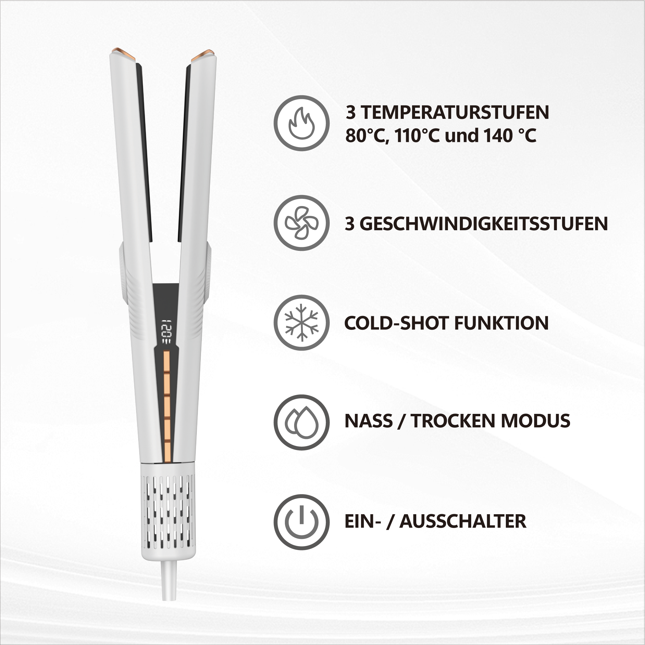 Whipl™ Straithair Pro har tre förinställda temperaturer i vått läge: 80°C, 110°C och 140°C. Dessa alternativ ger den perfekta värmen för olika hårtyper och säkerställer ett personligt stylingresultat